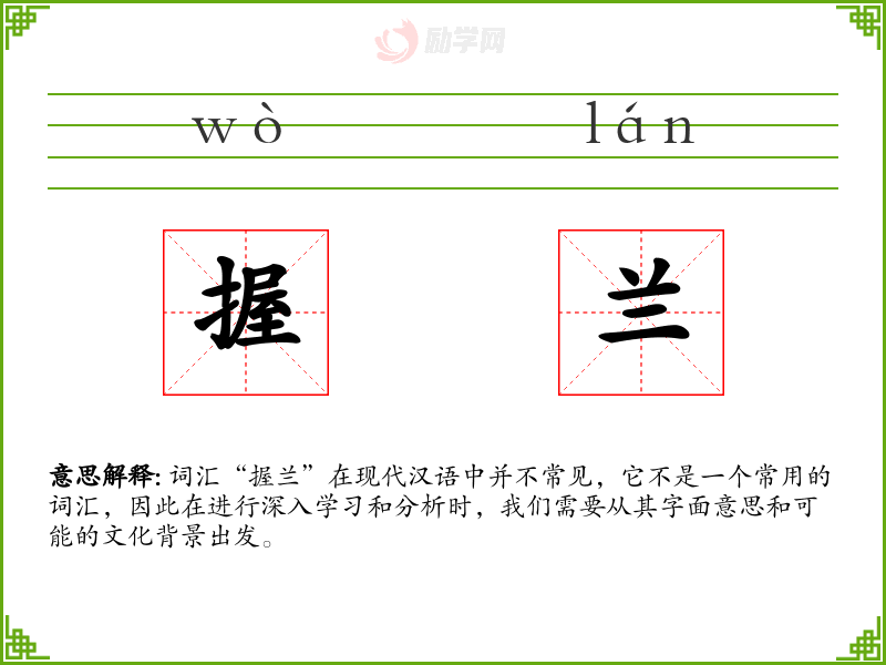 词汇“握兰”在现代汉语中并不常见,它不是一个常用的词汇,因此在进行深入学*和分析时,我们需要从其字面意思和可能的文化背景出发。