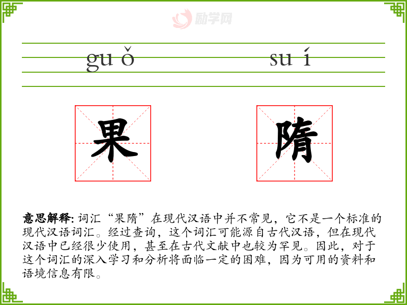 词汇“果隋”在现代汉语中并不常见,它不是一个标准的现代汉语词汇。经过查询,这个词汇可能源自古代汉语,但在现代汉语中已经很少使用,甚至在古代文献中也较为罕见。因此,对于这个词汇的深入学习和分析将面临一定的困难,因为可用的资料和语境信息有限。
