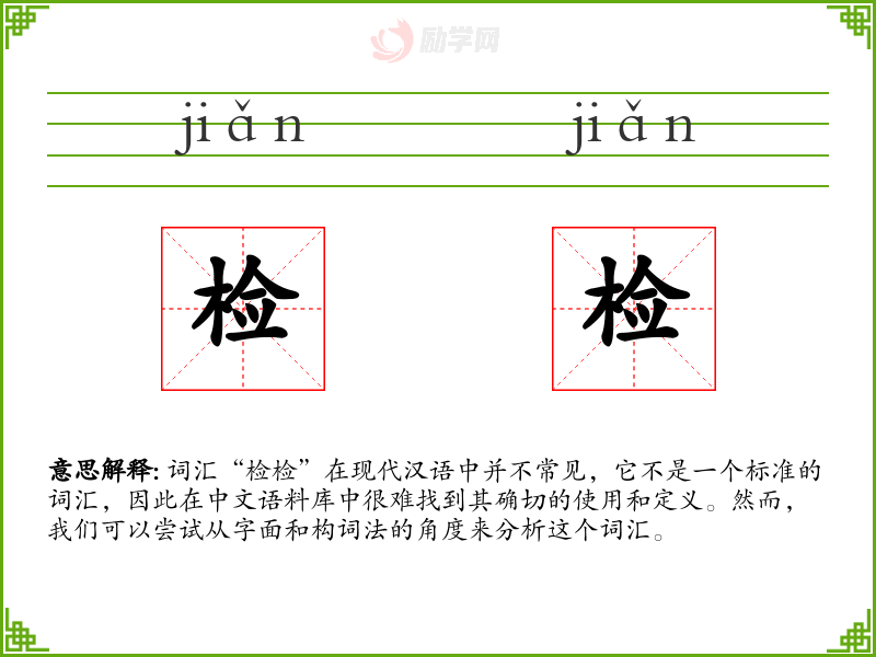 词汇“检检”在现代汉语中并不常见,它不是一个标准的词汇,因此在中文语料库中很难找到其确切的使用和定义。然而,我们可以尝试从字面和构词法的角度来分析这个词汇。