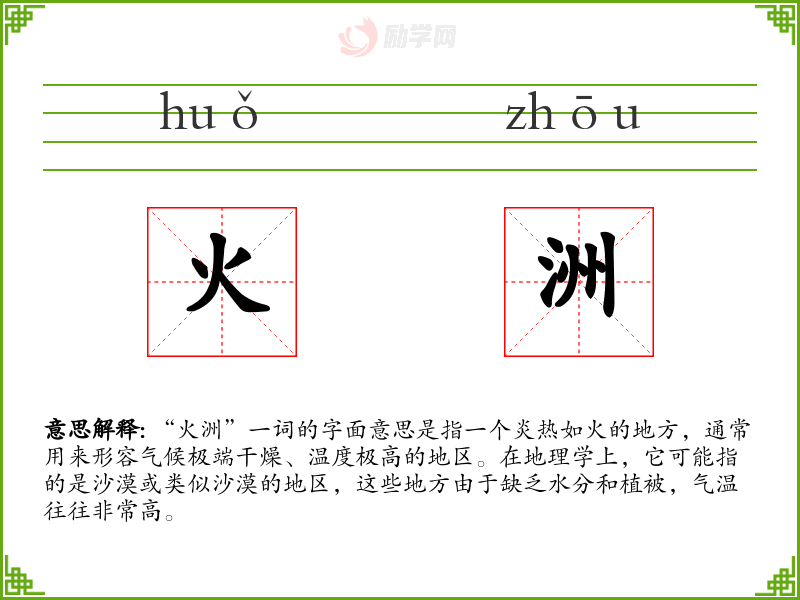 “火洲”一词的字面意思是指一个炎热如火的地方,通常用来形容气候极端干燥、温度极高的地区。在地理学上,它可能指的是沙漠或类似沙漠的地区,这些地方由于缺乏水分和植被,气温往往非常高。