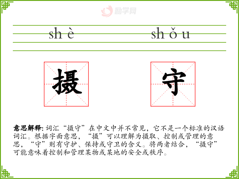 词汇“摄守”在中文中并不常见,它不是一个标准的汉语词汇。根据字面意思,“摄”可以理解为摄取、控制或管理的意思,“守”则有守护、保持或守卫的含义。将两者结合,“摄守”可能意味着控制和管理某物或某地的安全或秩序。