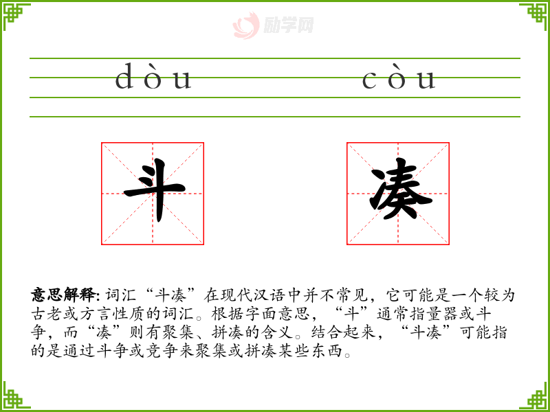 词汇“斗凑”在现代汉语中并不常见,它可能是一个较为古老或方言性质的词汇。根据字面意思,“斗”通常指量器或斗争,而“凑”则有聚集、拼凑的含义。结合起来,“斗凑”可能指的是通过斗争或竞争来聚集或拼凑某些东西。