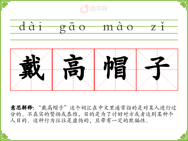 “戴高帽子”这个词汇在中文里通常指的是对某人进行过分的、不真实的赞扬或恭维,目的是为了讨好对方或者达到某种个人目的。这种行为往往是虚伪的,且带有一定的欺骗性。