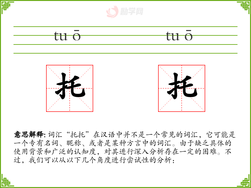由于“托托”不是一个常见的词汇,对其的理解和应用需要具体语境的支持。在语言学习和表达中,了解词汇的具体含义和使用背景是非常重要的。