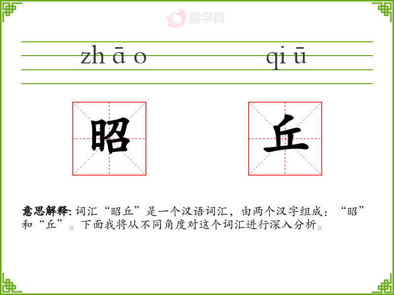 通过以上分析,我们可以看到“昭丘”这个词汇不仅具有字面意义,还蕴含着丰富的文化和社会背景,能够激发人们的情感和联想,是一个值得深入学*和探索的词汇。