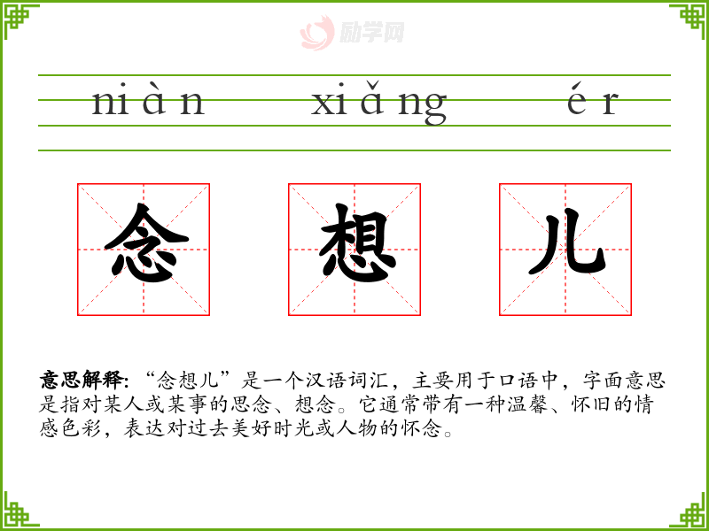 “念想儿”源自汉语,其中的“念”字意为思念,而“想儿”则是一种口语化的表达,强调了思念的情感色彩。随着时间的推移,这个词汇在口语中得到了广泛应用,成为表达深切思念的常用词汇。