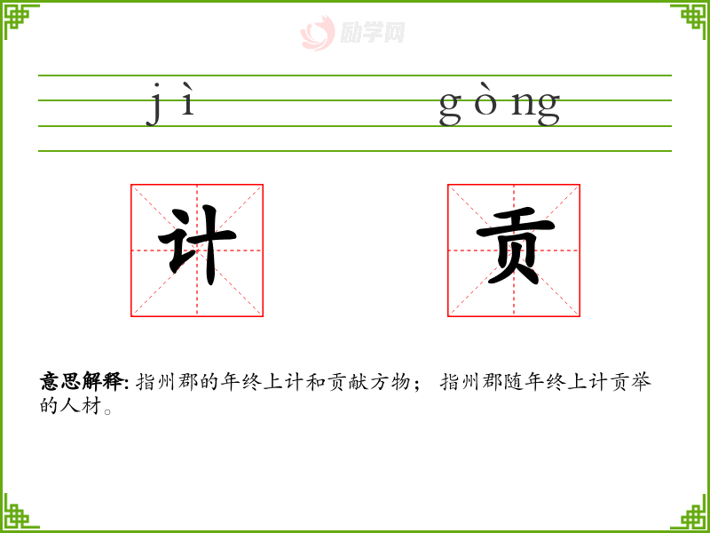 计贡的意思是:指州郡的年终上计和贡献方物; 指州郡随年终上计贡举的人材。