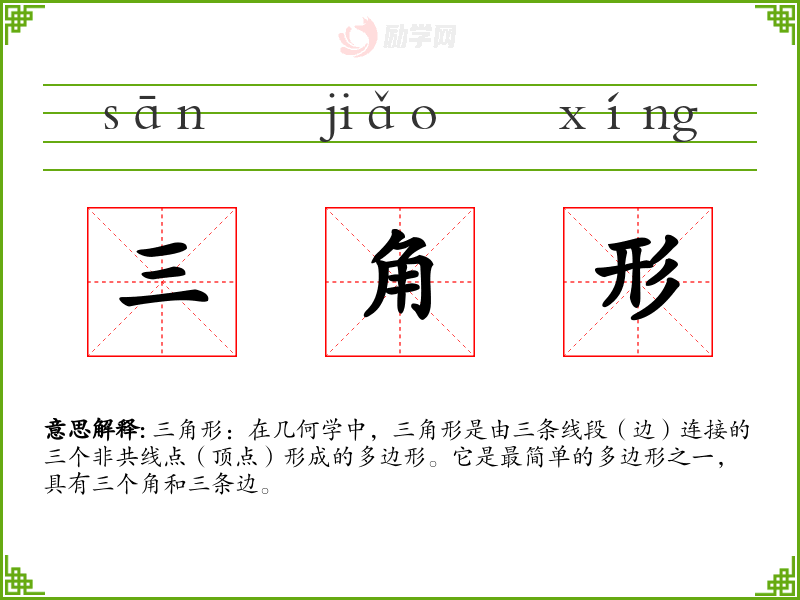 三角形一词源自拉丁语“triangulum”,意为“三边”,由“tri-”(三)和“angulus”(角)组成。在古希腊数学中,三角形是几何学的基础,由欧几里得等数学家深入研究。