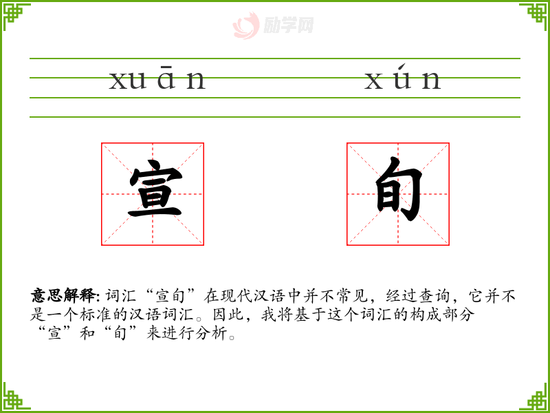 词汇“宣旬”在现代汉语中并不常见,经过查询,它并不是一个标准的汉语词汇。因此,我将基于这个词汇的构成部分“宣”和“旬”来进行分析。