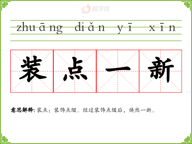 装点一新的意思是:装点:装饰点缀。经过装饰点缀后,焕然一新。