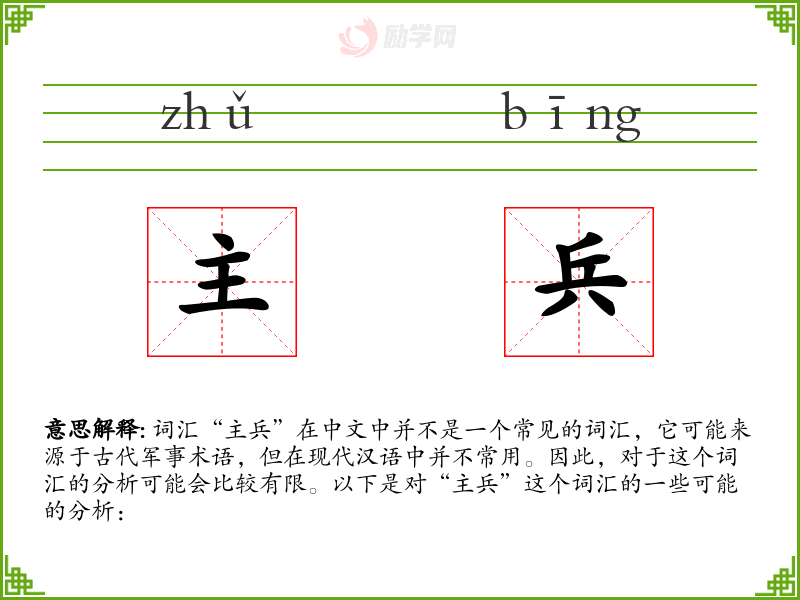 词汇“主兵”在中文中并不是一个常见的词汇,它可能来源于古代军事术语,但在现代汉语中并不常用。因此,对于这个词汇的分析可能会比较有限。以下是对“主兵”这个词汇的一些可能的分析: