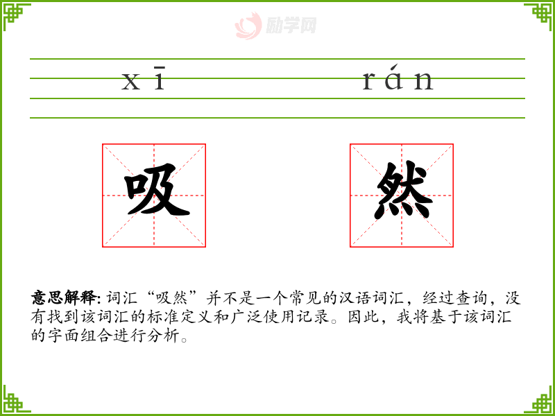 词汇“吸然”并不是一个常见的汉语词汇,经过查询,没有找到该词汇的标准定义和广泛使用记录。因此,我将基于该词汇的字面组合进行分析。