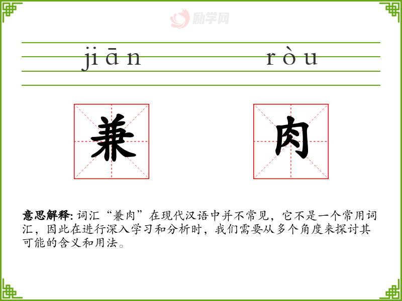 词汇“兼肉”在现代汉语中并不常见,它不是一个常用词汇,因此在进行深入学习和分析时,我们需要从多个角度来探讨其可能的含义和用法。