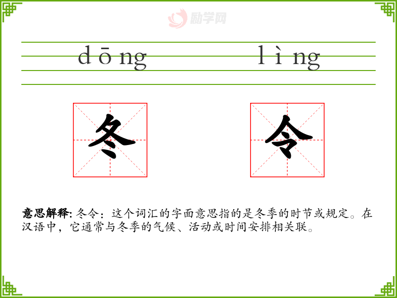 冬令:这个词汇的字面意思指的是冬季的时节或规定。在汉语中,它通常与冬季的气候、活动或时间安排相关联。