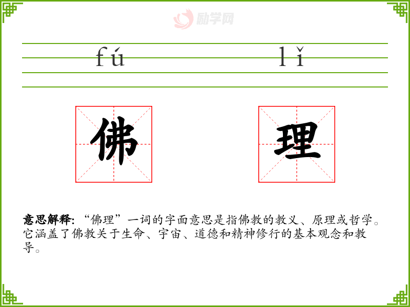 - 反义词:无(由于“佛理”特指**的教义,没有直接的反义词)