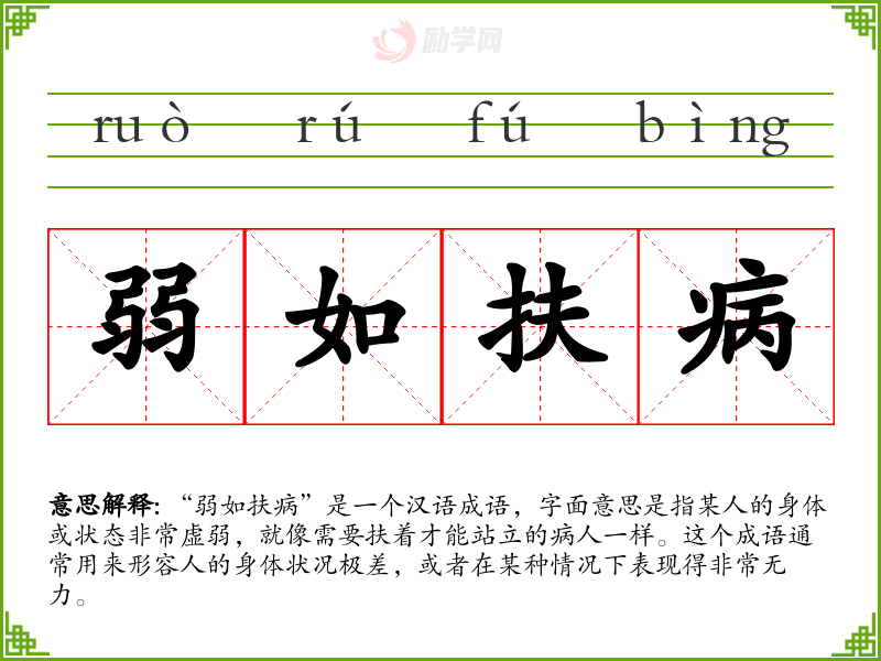 “弱如扶病”是一个汉语成语,字面意思是指某人的身体或状态非常虚弱,就像需要扶着才能站立的病人一样。这个成语通常用来形容人的身体状况极差,或者在某种情况下表现得非常无力。