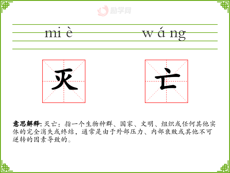 - 专业领域:在生物学或环境科学中,“灭亡”特指物种的灭绝。