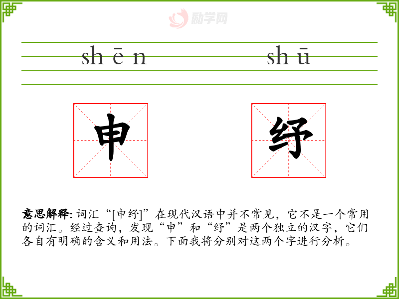 词汇“[申纾]”在现代汉语中并不常见,它不是一个常用的词汇。经过查询,发现“申”和“纾”是两个独立的汉字,它们各自有明确的含义和用法。下面我将分别对这两个字进行分析。