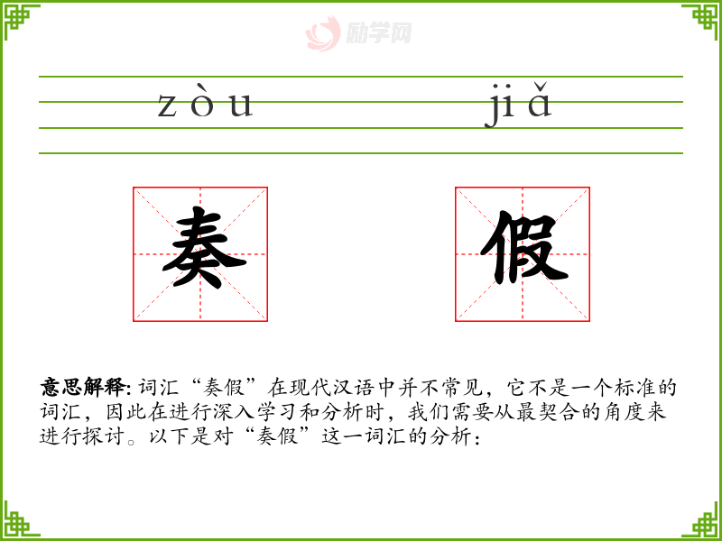 词汇“奏假”在现代汉语中并不常见,它不是一个标准的词汇,因此在进行深入学习和分析时,我们需要从最契合的角度来进行探讨。以下是对“奏假”这一词汇的分析: