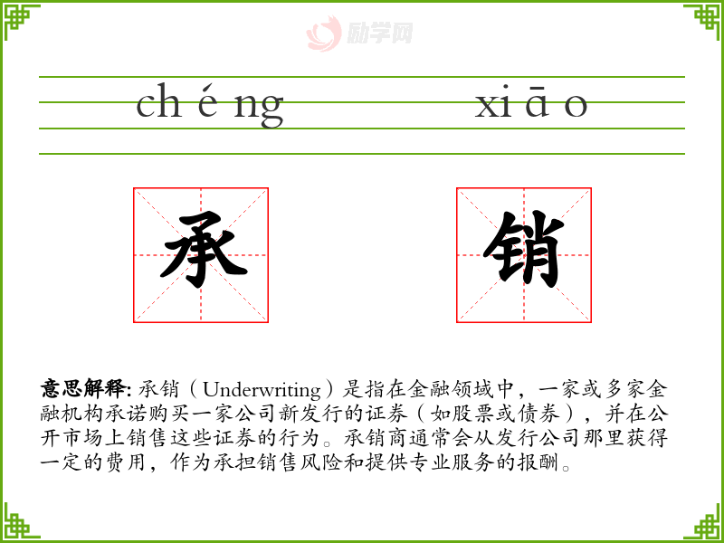 - 同义词:包销(更强调承销商对全部证券的购买承诺)