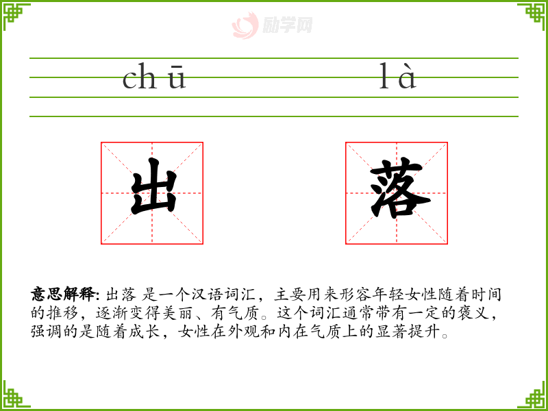 出落 是一个汉语词汇,主要用来形容年轻女性随着时间的推移,逐渐变得美丽、有气质。这个词汇通常带有一定的褒义,强调的是随着成长,女性在外观和内在气质上的显著提升。