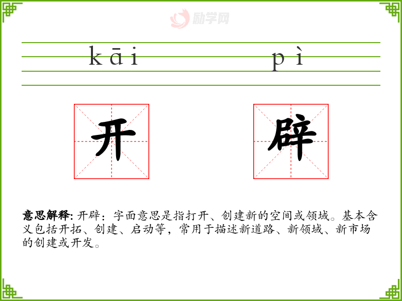 开辟:字面意思是指打开、创建新的空间或领域。基本含义包括开拓、创建、启动等,常用于描述新道路、新领域、新市场的创建或开发。