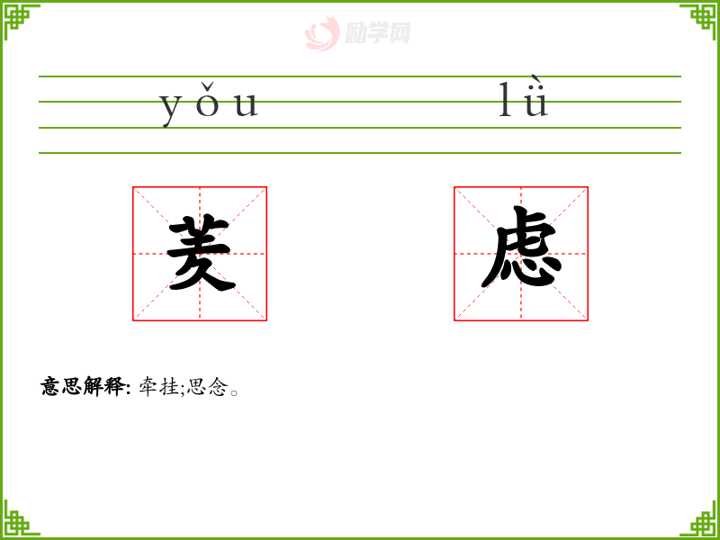 虑[ lǜ ] 1. (形声。从思,虍(hū)声。本义:思虑,谋划)。 2. 同本义。 【引证】 《说文》-虑,谋思也。 《墨子·亲士》-非士无与虑国。 《诗·小雅·雨无止》-弗虑弗图。 《荀子·礼论》-礼之中焉,能思索谓之能虑。 《史记·淮阴侯列传》-臣闻智者千虑,必有一失;愚者千虑,必有一得。 汉·贾谊《过秦论》-深谋远虑。 《战国策·燕策》-足下更虑之。 【组词】 考虑、 虑尽、 虑佚、 虑事多暗、 虑思、 虑计 [更多解释]