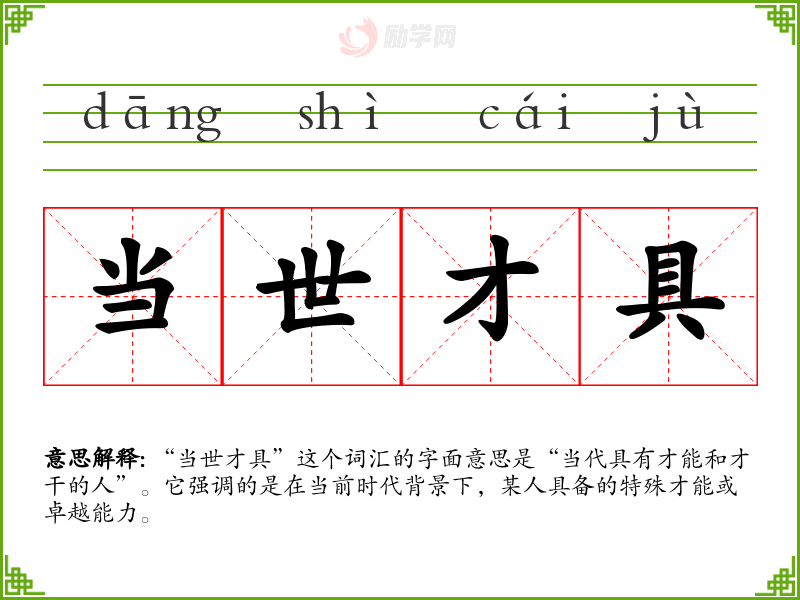 “当世才具”这个词汇的字面意思是“当代具有才能和才干的人”。它强调的是在当前时代背景下,某人具备的特殊才能或卓越能力。