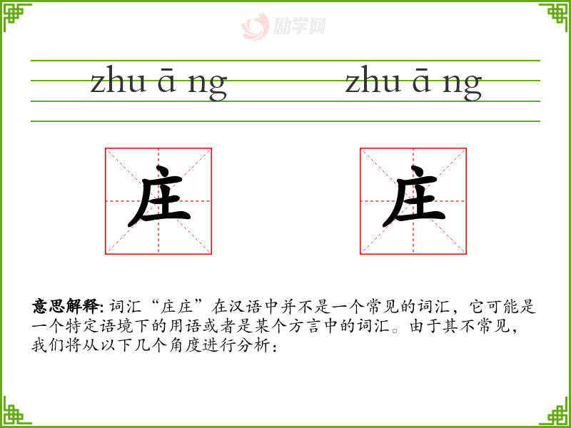 综上所述,词汇“庄庄”在标准汉语中并不存在,因此无法进行深入的学习和分析。如果“庄庄”是某个特定语境下的用语或者是某个方言中的词汇,需要更多的上下文信息才能进行准确的分析。