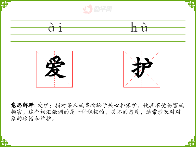 爱护:指对某人或某物给予关心和保护,使其不受伤害或损害。这个词汇强调的是一种积极的、关怀的态度,通常涉及对对象的珍惜和维护。