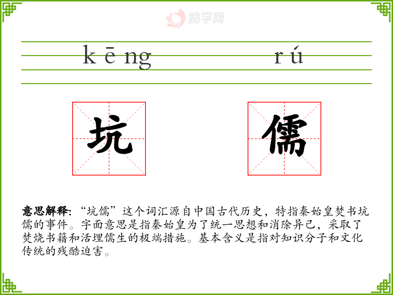 “坑儒”一词直接来源于秦始皇的历史**。随着时间的推移,这个词逐渐被用来泛指对知识分子的迫害和对文化传统的破坏。在现代语境中,它更多地被用作一个比喻,用来批评那些压制知识和文化的行为。