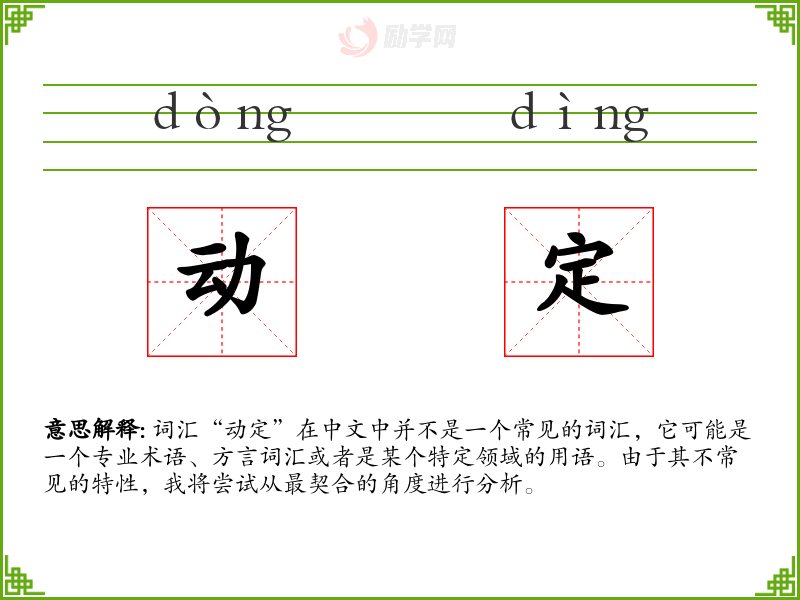 由于“动定”不是一个常见的词汇,它在不同语境下的使用可能较为有限。在某些专业领域,如物理学、工程学或者体育训练中,可能会有特定的含义。