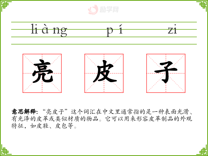 “亮皮子”这个词汇在中文里通常指的是一种表面光滑、有光泽的皮革或类似材质的物品。它可以用来形容皮革制品的外观特征,如皮鞋、皮包等。