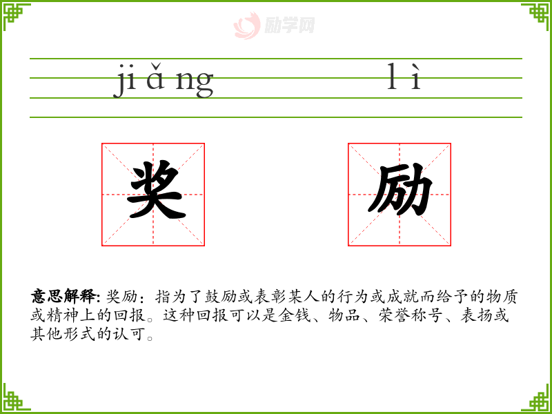 奖励:指为了鼓励或表彰某人的行为或成就而给予的物质或精神上的回报。这种回报可以是金钱、物品、荣誉称号、表扬或其他形式的认可。