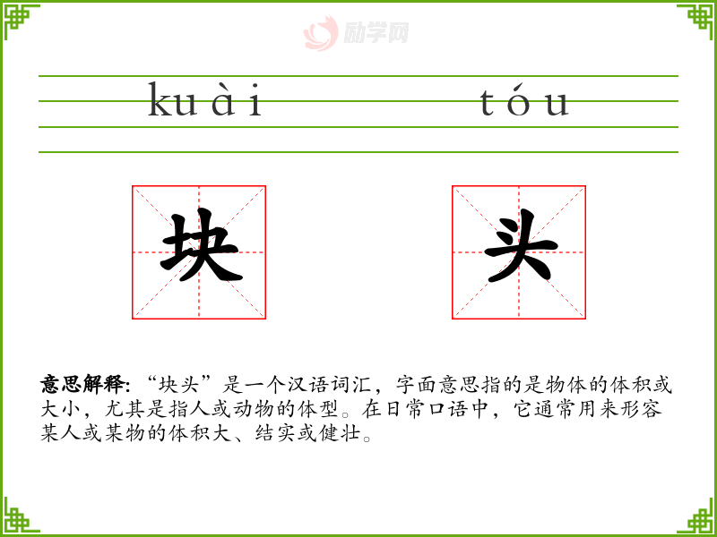 “块头”是一个汉语词汇,字面意思指的是物体的体积或大小,尤其是指人或动物的体型。在日常口语中,它通常用来形容某人或某物的体积大、结实或健壮。