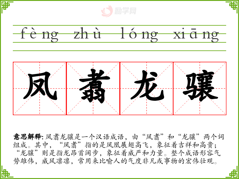 凤翥龙骧这个成语在*语言和文化中占有重要地位,它不仅丰富了汉语的表达方式,也承载了深厚的文化内涵。通过对这个成语的学和分析,我更加深刻地理解了它在不同语境中的应用和意义,也认识到了它在语言学*和表达中的重要性。