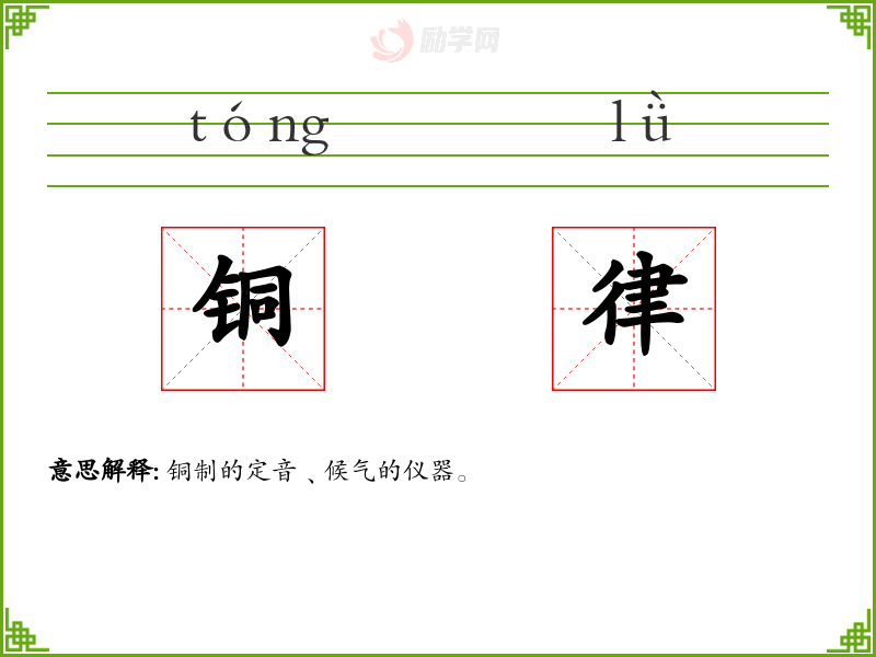 铜律的意思是:铜制的定音﹑候气的仪器。
