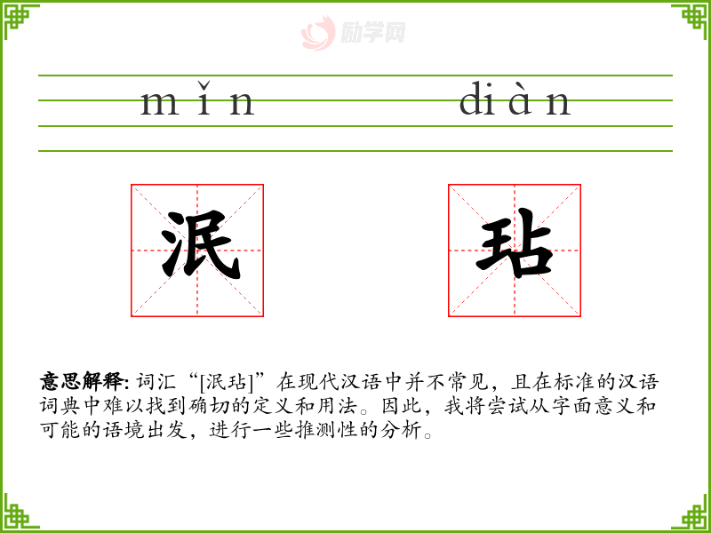 词汇“[泯玷]”在现代汉语中并不常见,且在标准的汉语词典中难以找到确切的定义和用法。因此,我将尝试从字面意义和可能的语境出发,进行一些推测性的分析。